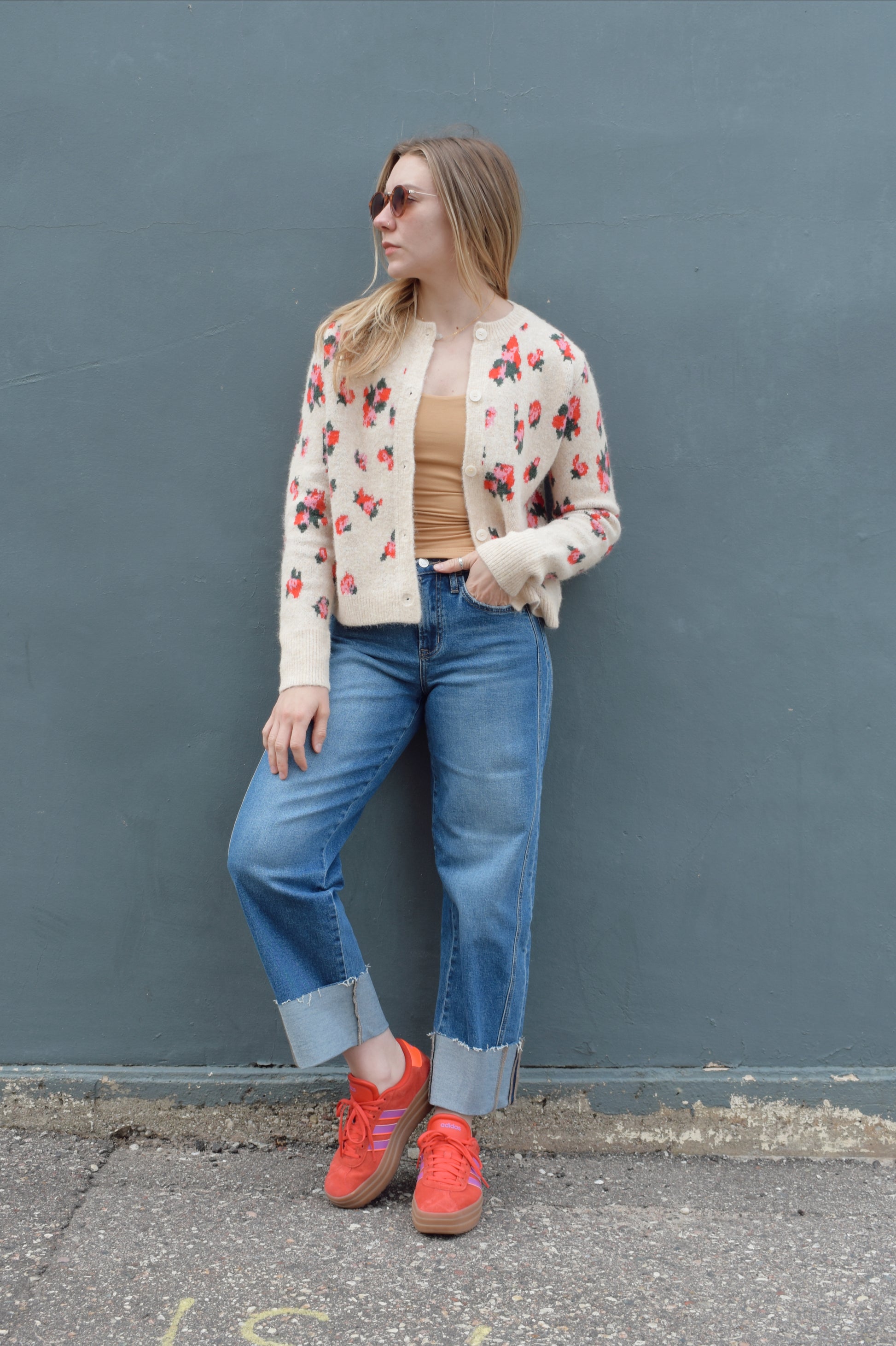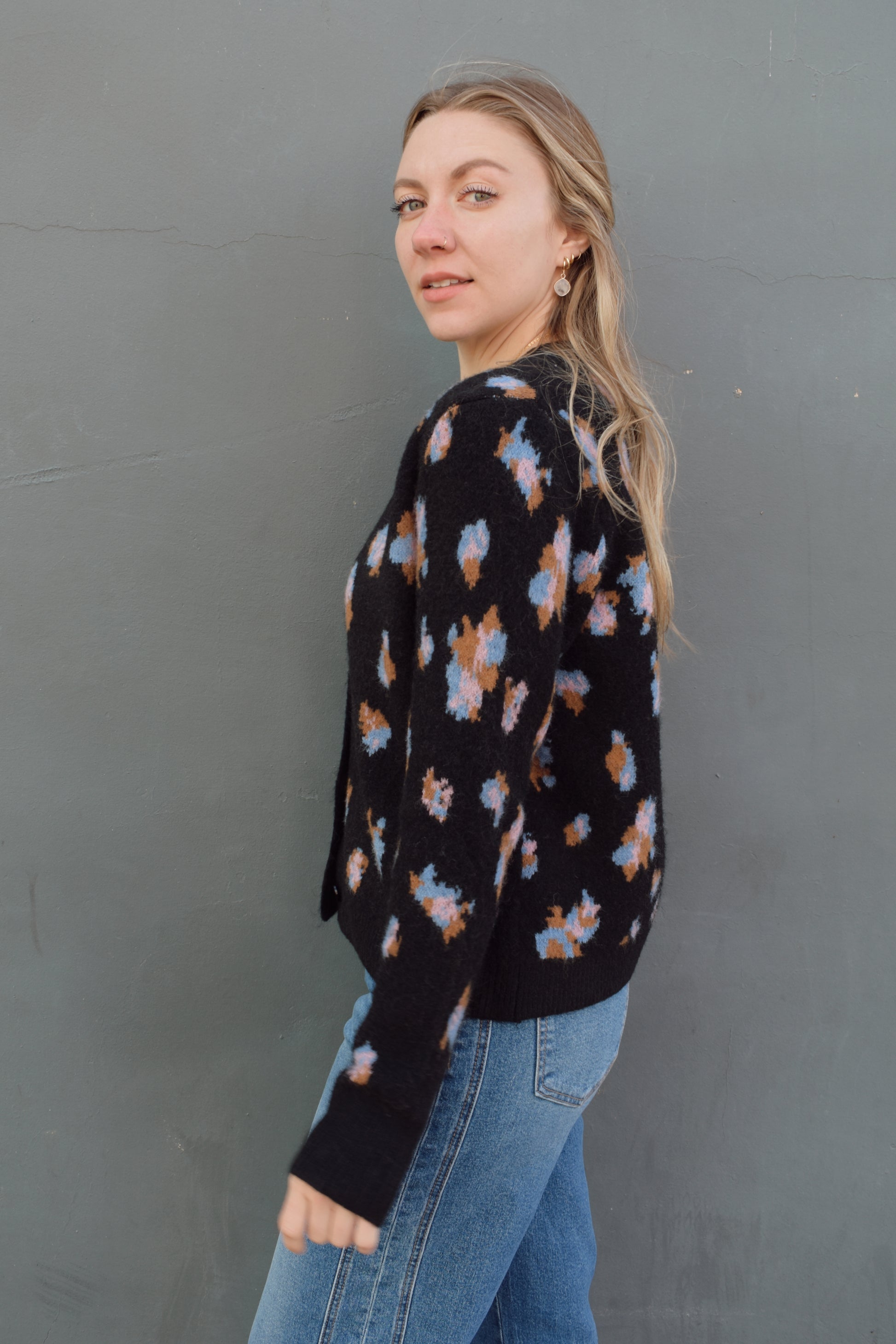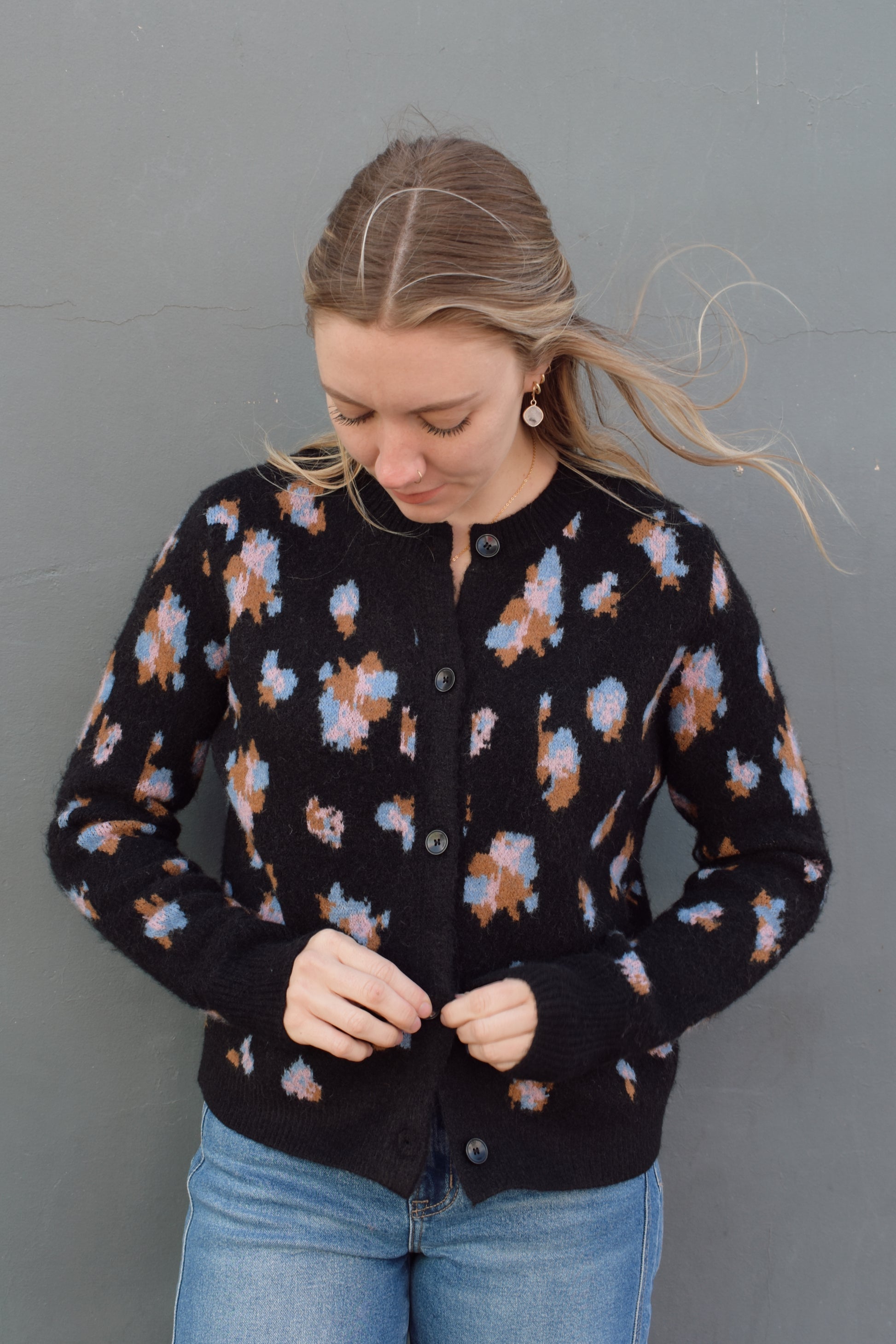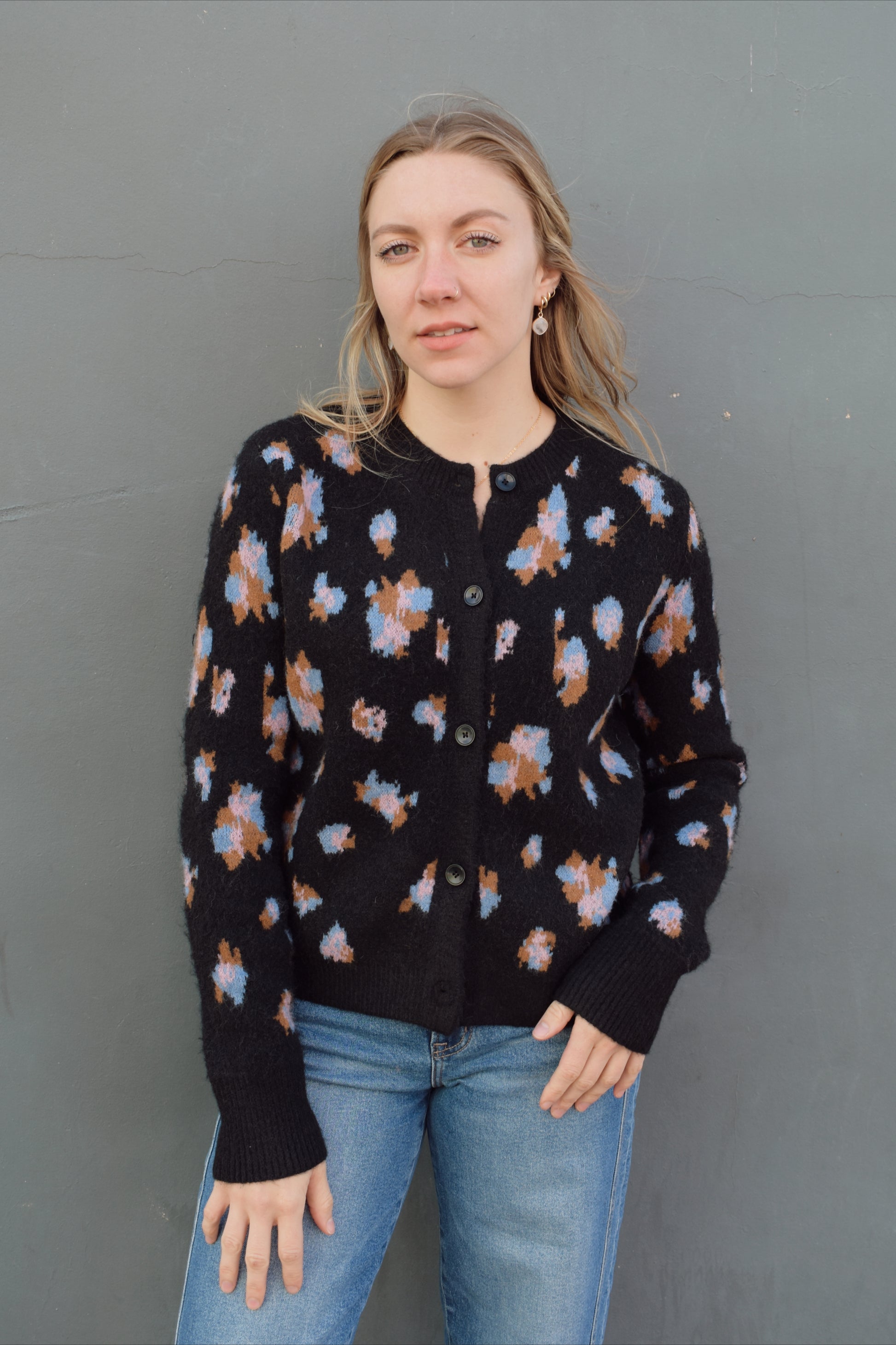 This abstract floral cardigan features a ribbed round neckline and a button-down front. It showcases a unique all-over abstract floral knit pattern, complemented by long sleeves with ribbed cuffs. Designed to sit at the waist, this cardigan offers both style and comfort for your everyday wardrobe.