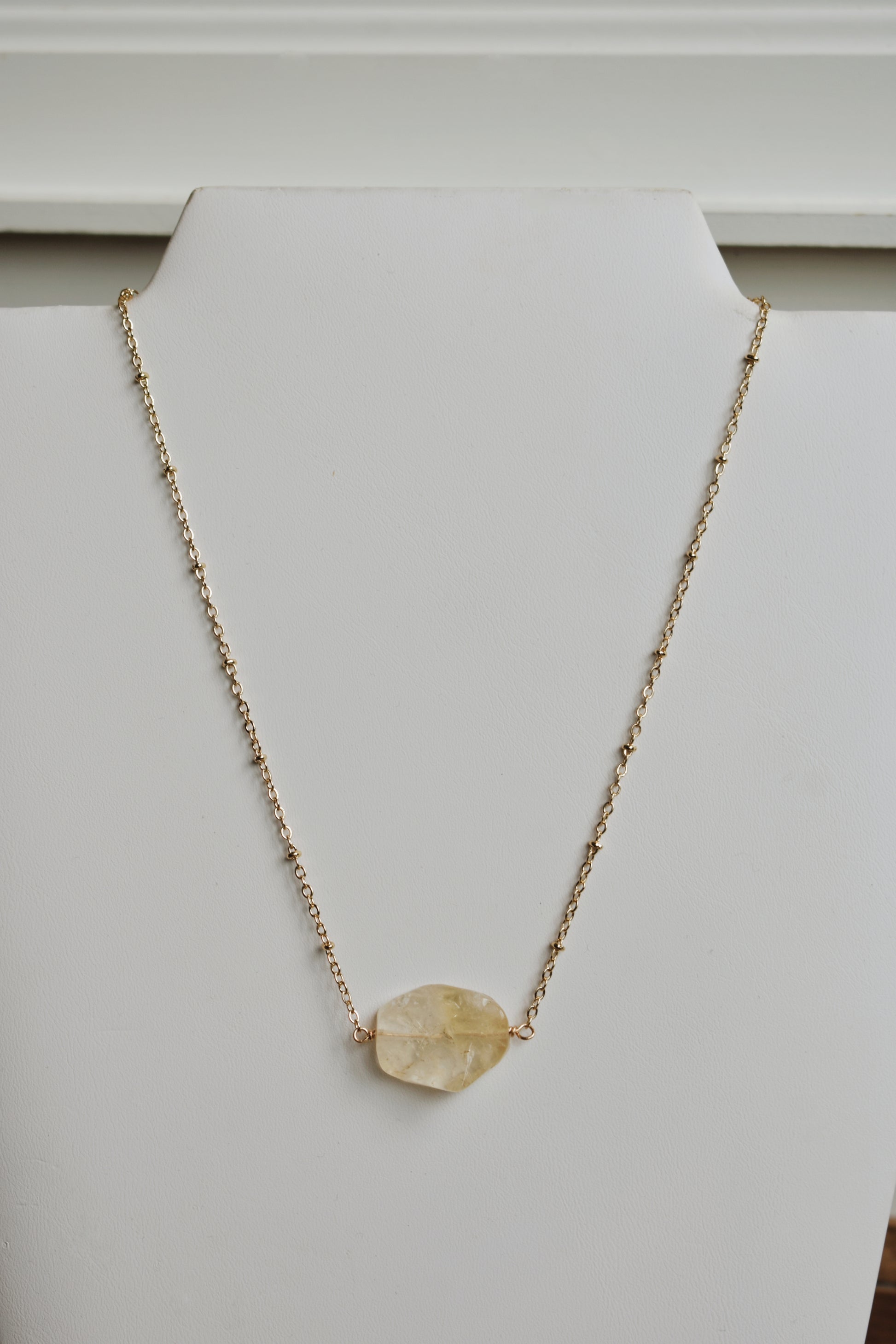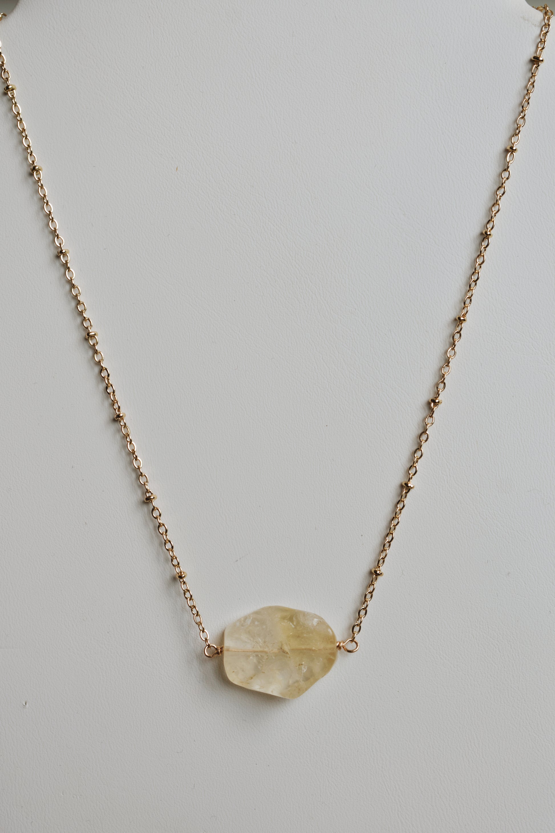 A tumbled citrine chunk pendant wired to dainty gold plated satellite chain. Experience the healing power of citrine with our stunning tumbled chunk pendant. Each piece is specially selected and wired to a dainty gold plated satellite chain, providing you with a stylish and versatile piece of jewelry that will also enhance your overall well-being. Citrine is known for its ability to promote abundance, prosperity, and success, making this necklace a must-have for those seeking to invite more positivity into their lives. Add it to your collection and see the benefits for yourself.