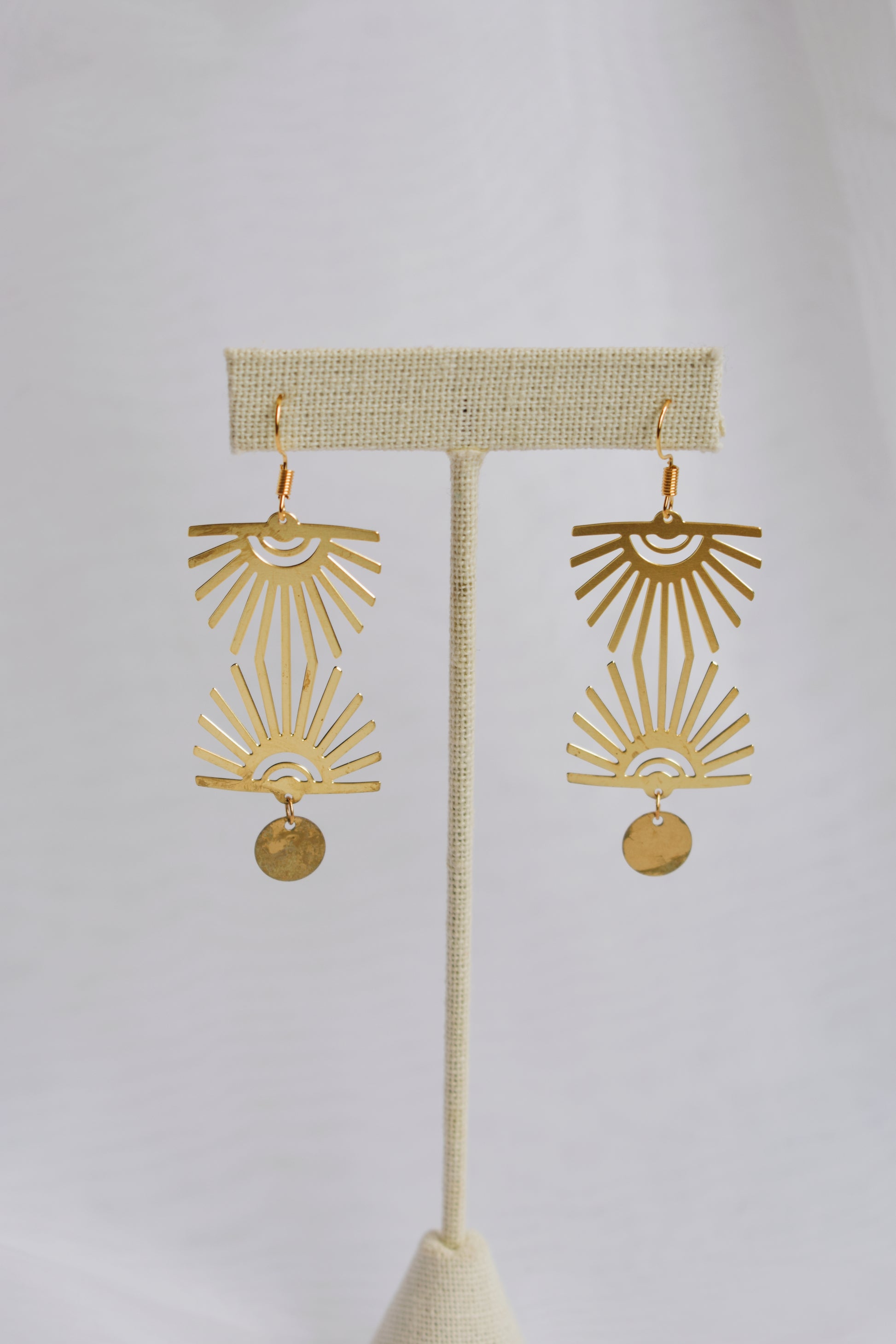 Our Double Burst Earrings balance style and elegance. Crafted with precision and gold plated, the light weight pendants bring a beautiful golden glow to any look. Transition easily from a polished office look to evening glamour. Prepare to receive compliments when wearing this captivating accessory. These earrings feature a double sunburst pendant, symbolizing luminosity, vitality, and possibility. Brass is plated with 24-karat gold for a radiant lasting glow. Gold-plated ear wires offer a perfect frame that illuminates your features. Capture celestial beauty, and find the perfect gift for yourself or a loved one.
