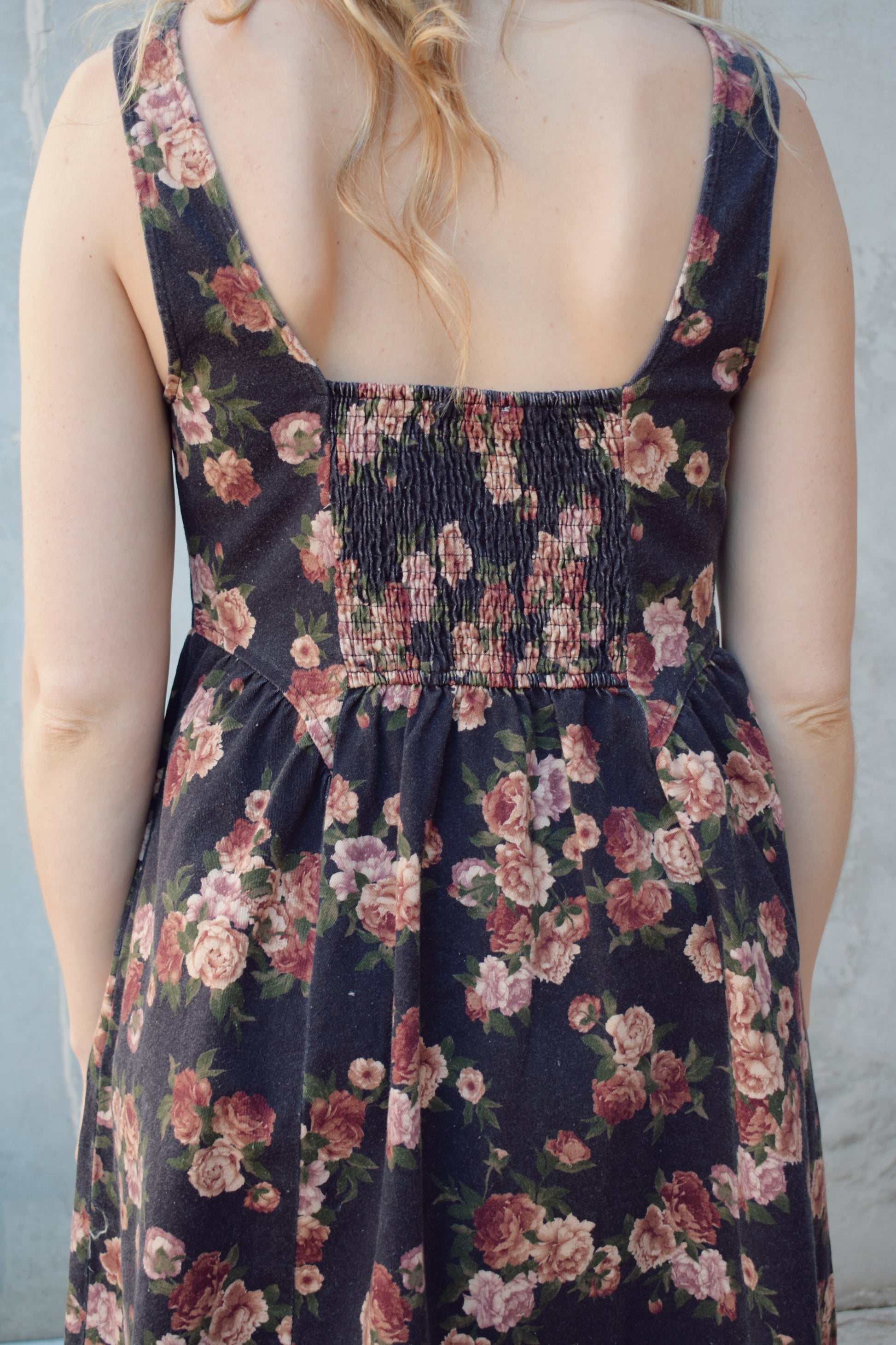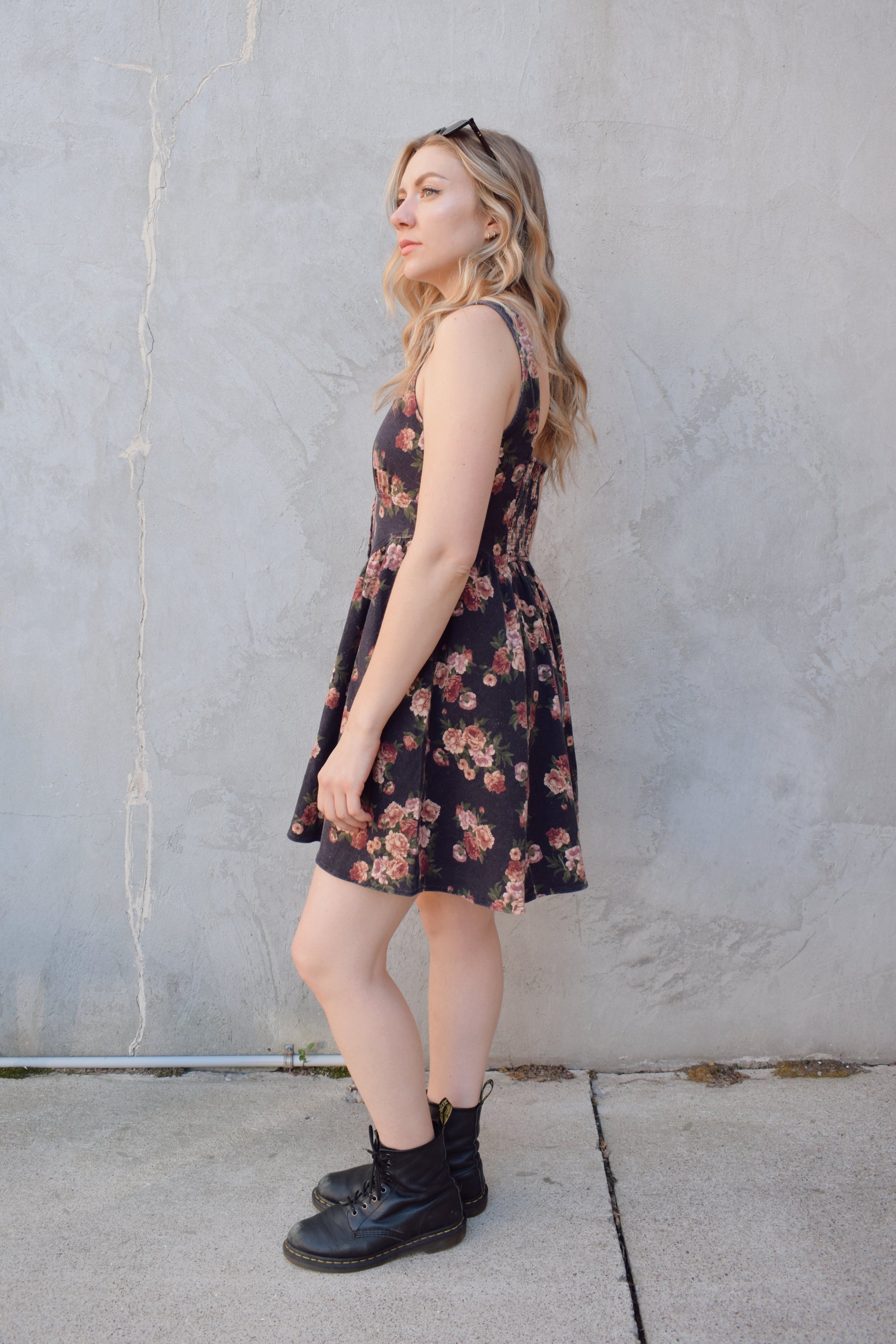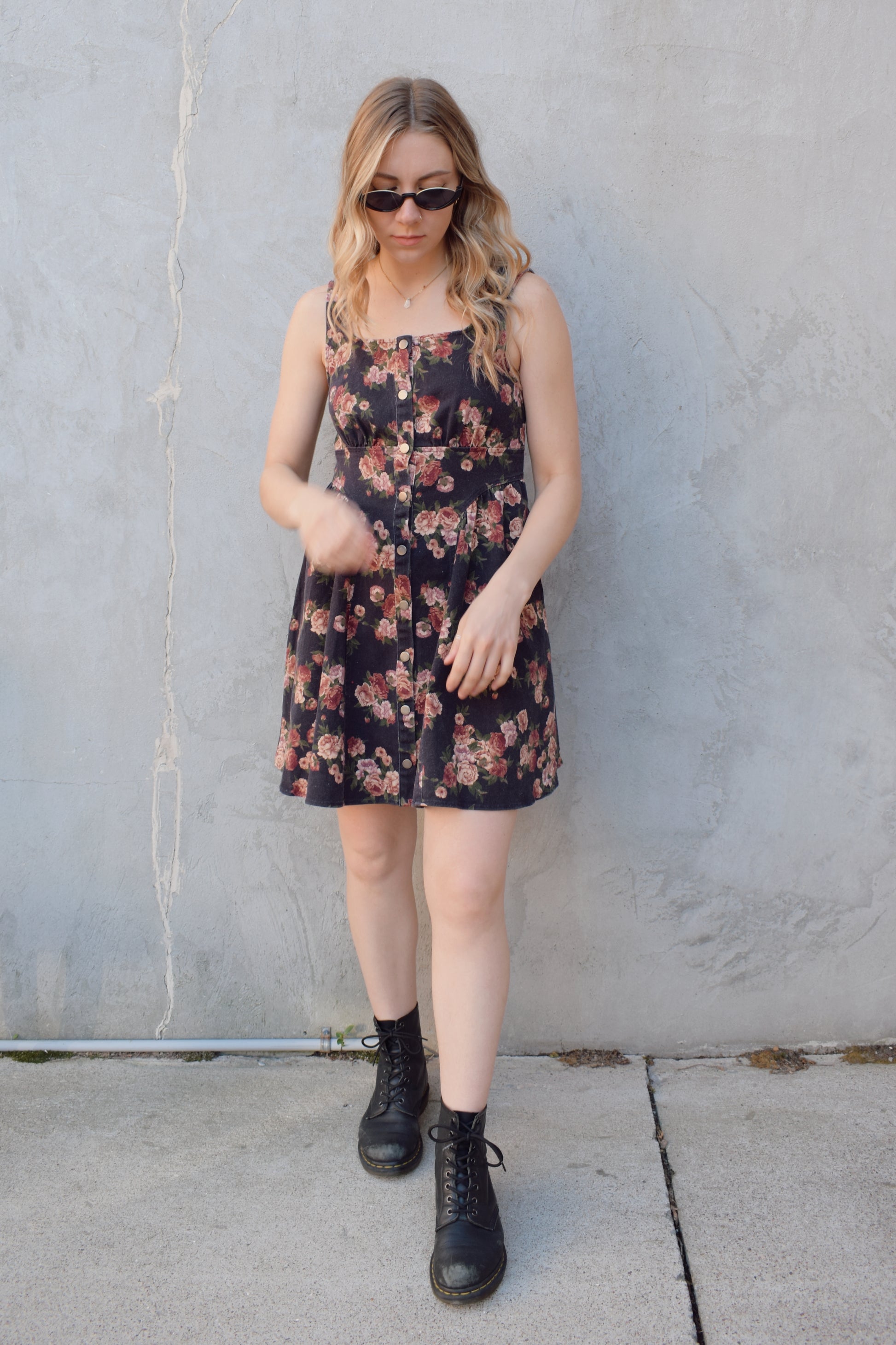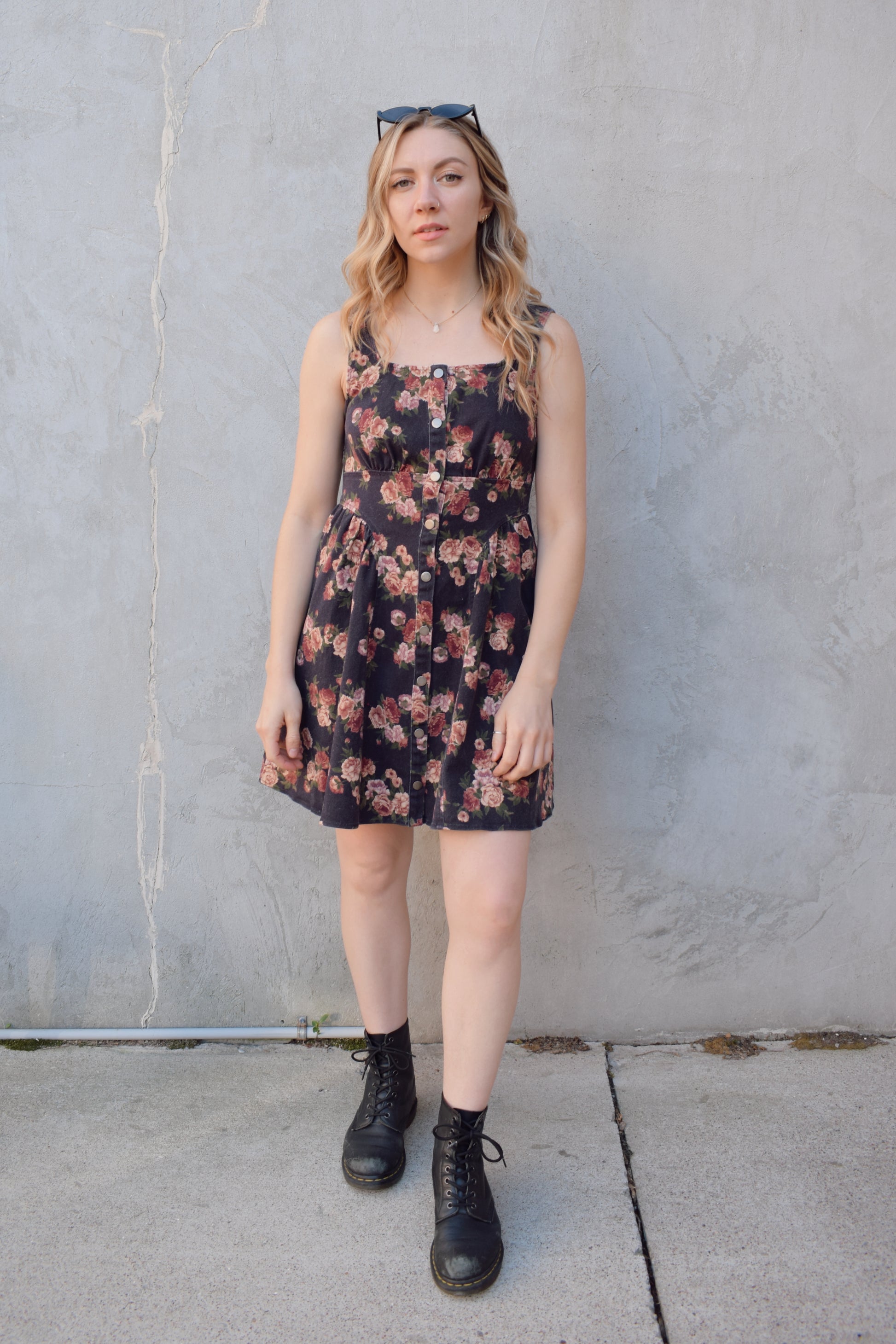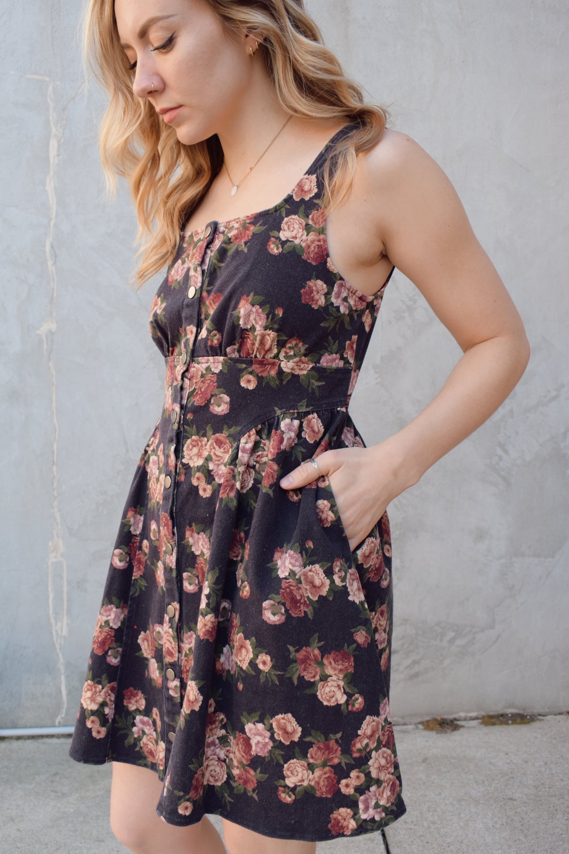 This stonewashed mini dress showcases a retro 90's floral pattern, snap-button front closure, and pleated skirt accents. With its square neckline and sleeveless cut, it provides a flattering fit that complements a variety of body shapes.