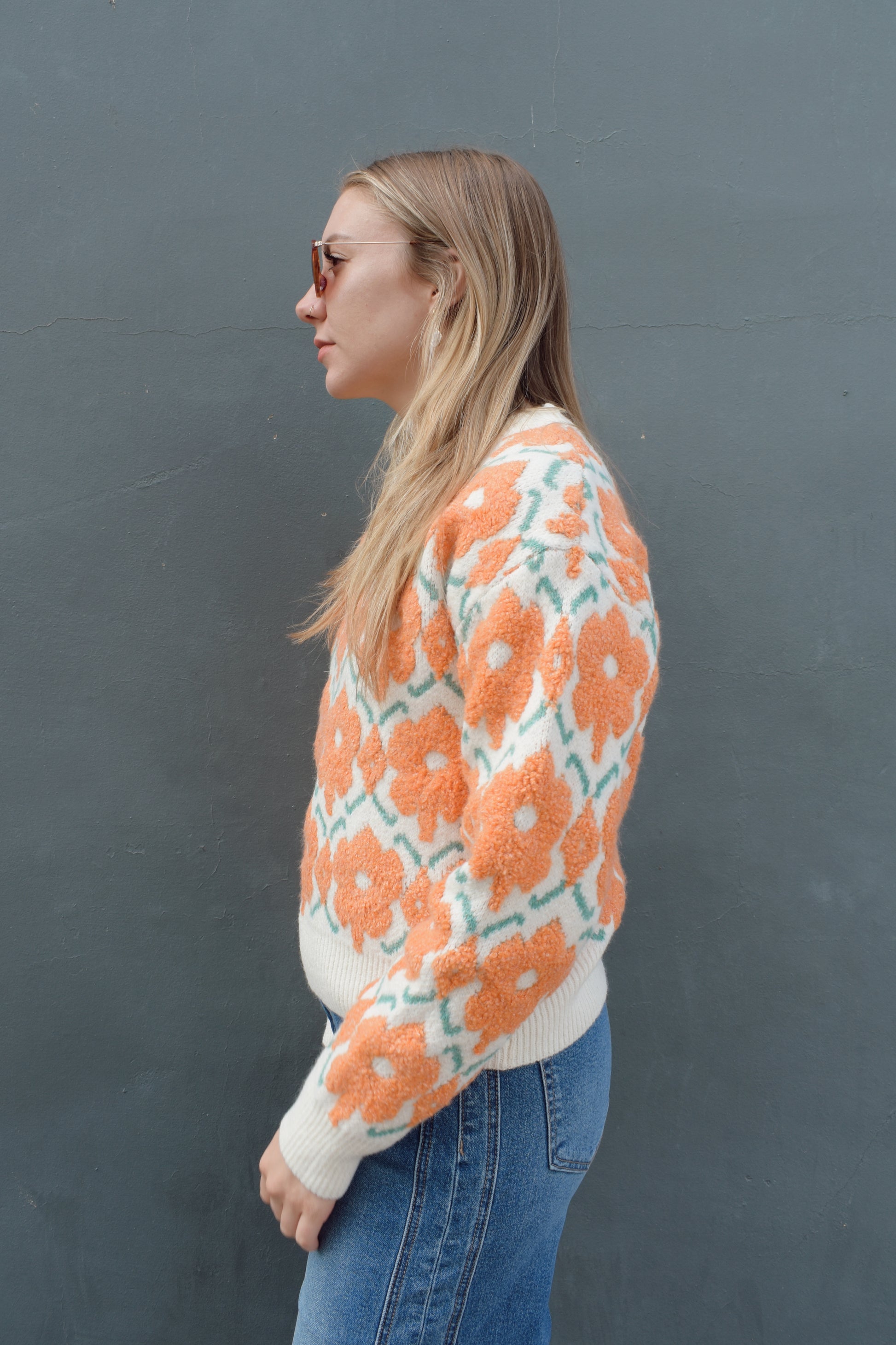 Experience cozy charm with this floral fuzzy sweater featuring a soft textured knit. It offers a relaxed pullover fit with a round neckline and drop shoulders for easy movement. Long sleeves and ribbed trims at the neckline, cuffs, and hem ensure lasting comfort and style. The delicate floral pattern adds a touch of warmth and elegance to your wardrobe.
