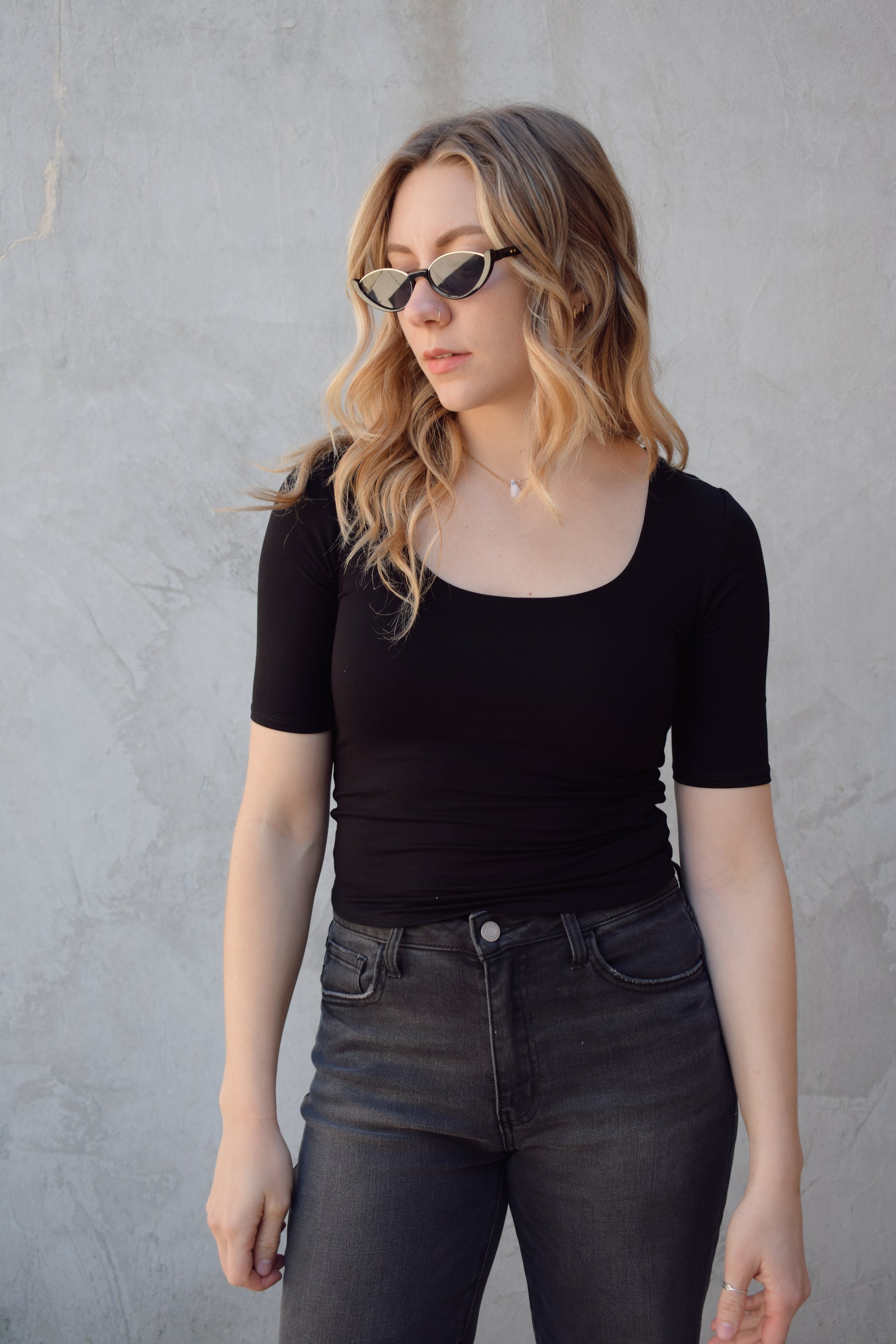 This essential half-sleeve crop top features a scoop neckline and a slim, stretch fit that flatters every figure. Its short, fitted sleeves and cropped length make it ideal for layering, effortlessly transitioning from casual outings to more polished looks. Perfect for daily wear, this versatile top combines comfort and style with ease.