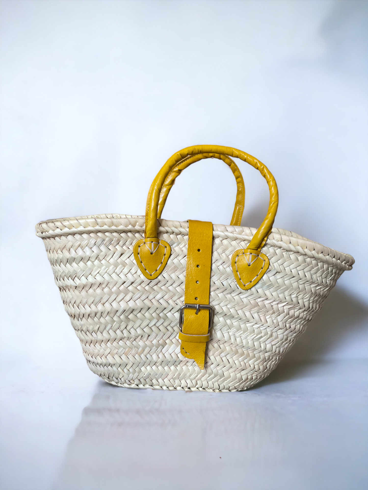 This French market classic is handwoven in Morocco from date palm leaves, creating a rich herringbone texture of sturdy natural fibers. Anchored by leather tabs, the doubled straps allow the basket to transition from tote to shoulder bag.