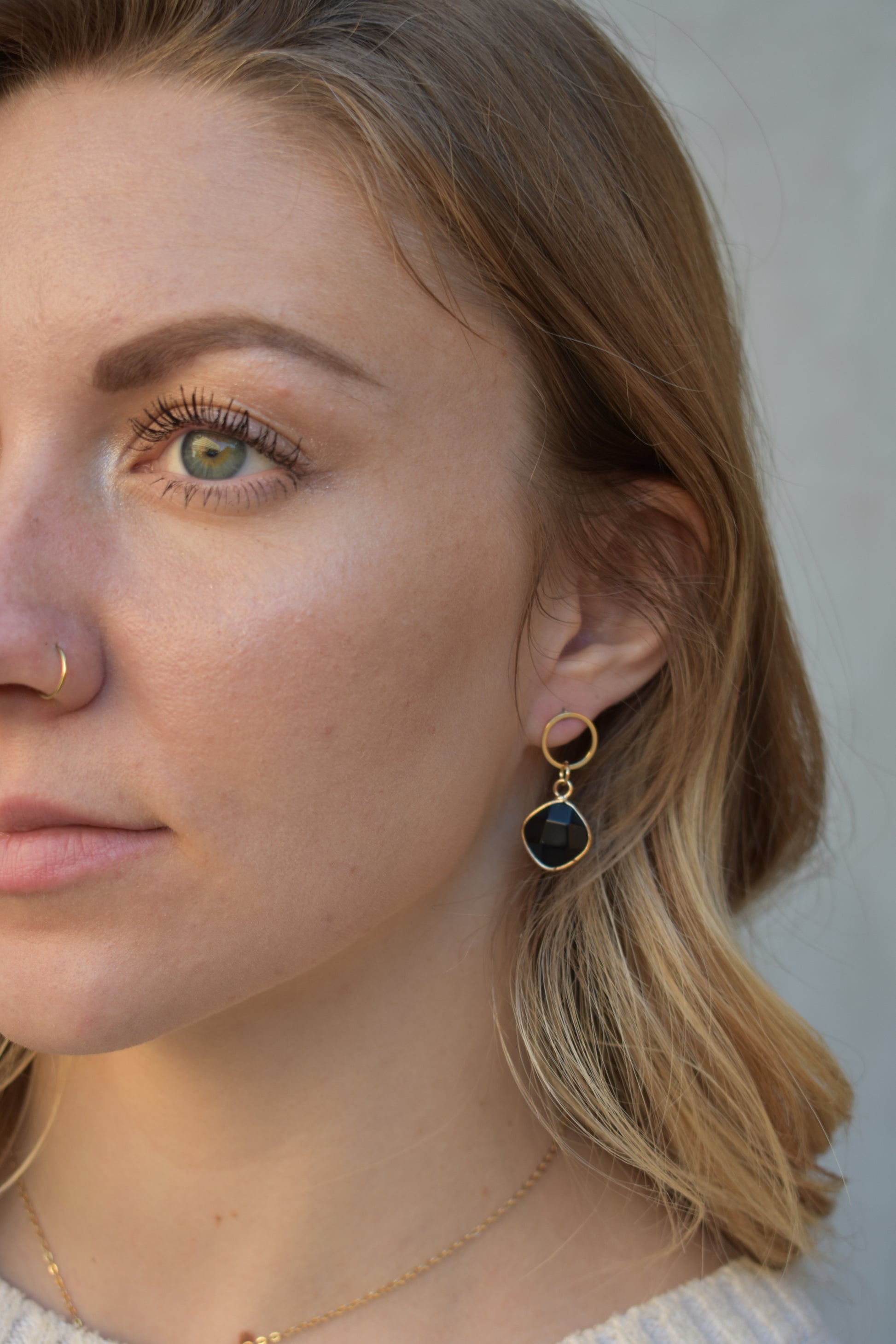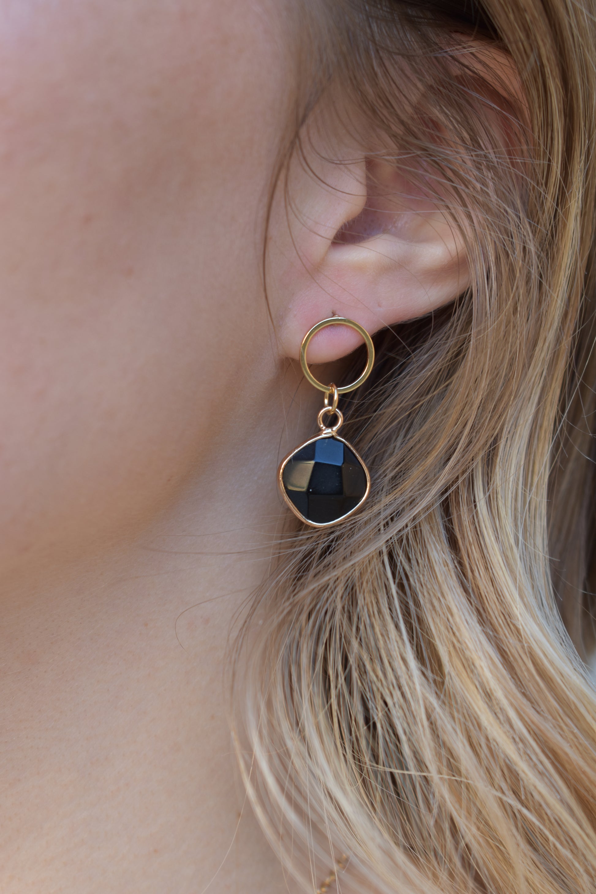 Add a touch of elegance and intrigue to your look with these stunning stud earrings. The faceted obsidian pendants catch the light beautifully, making these earrings a must-have for any fashion-forward individual. Elevate your style with these minimalist gold ring studs!