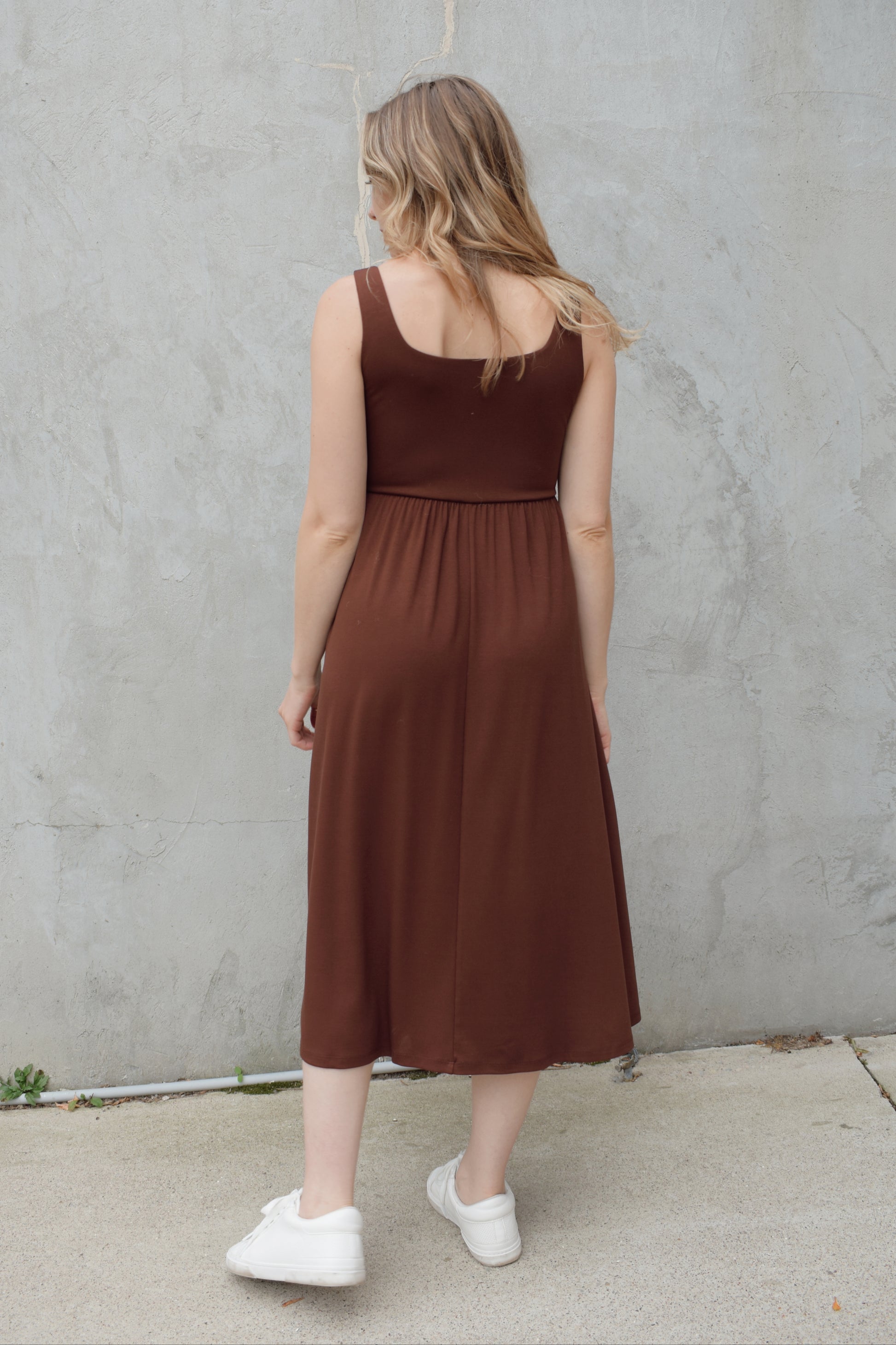 This midi-length sleeveless swing dress features a double-layered bodice for added coverage and support, along with convenient side pockets. Crafted from a soft, heavyweight jersey fabric, it provides exceptional stretch and comfort throughout the day.