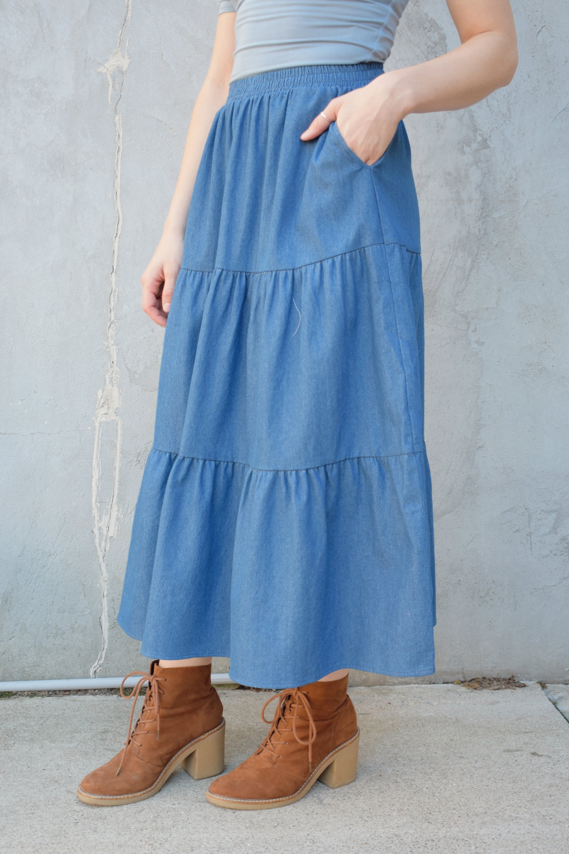 Elevate your casual wardrobe with this tiered midi denim skirt, designed to combine style and comfort effortlessly. Its elastic waistband ensures a flexible fit that moves with you, while the tiered design adds a flattering, feminine silhouette with subtle volume. Practical side pockets provide convenient storage for essentials, making this skirt as functional as it is fashionable. Perfect for pairing with your favorite tops and shoes, it’s an ideal choice for everyday wear or weekend outings. Experience a versatile, chic look that adapts seamlessly to your lifestyle.