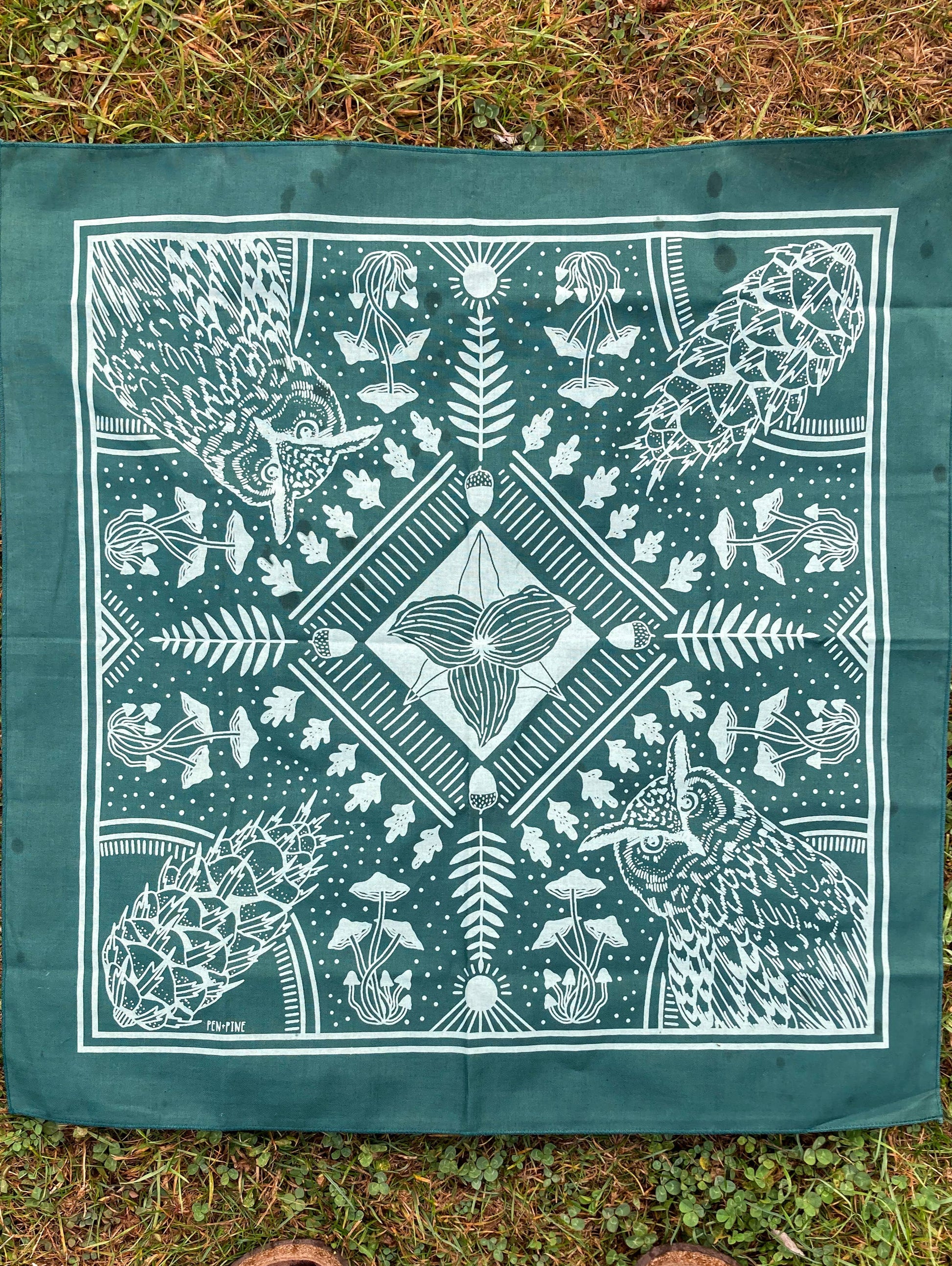 This 22” cotton bandana features a design of all of your woodland favorites: Douglas fir cone, great horned owl, acorns, ferns, and more! The illustration is silk screened with water-based ink in light green, on a dark green 100% cotton bandana. These bandanas are printed in California using eco-friendly methods. This gorgeous, high-quality bandana has so many uses: wear it as a face covering, use it as wrapping paper, tie it in your hair, wear it as a headband, or hang it up on your wall as art!