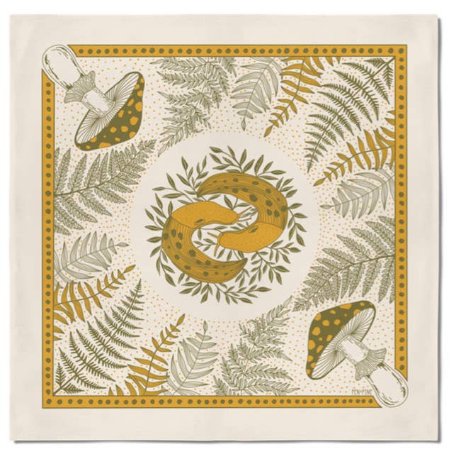 This 22” cotton bandana features a design of ferns, mushrooms and banana slugs. The illustration is silk screened with water-based ink in green and mustard yellow, on a natural tan colored bandana. These bandanas are printed in California using eco-friendly methods. This gorgeous, high-quality bandana has so many uses: wear it as a face covering, use it as wrapping paper, tie it in your hair, wear it as a headband, or hang it up on your wall as art!