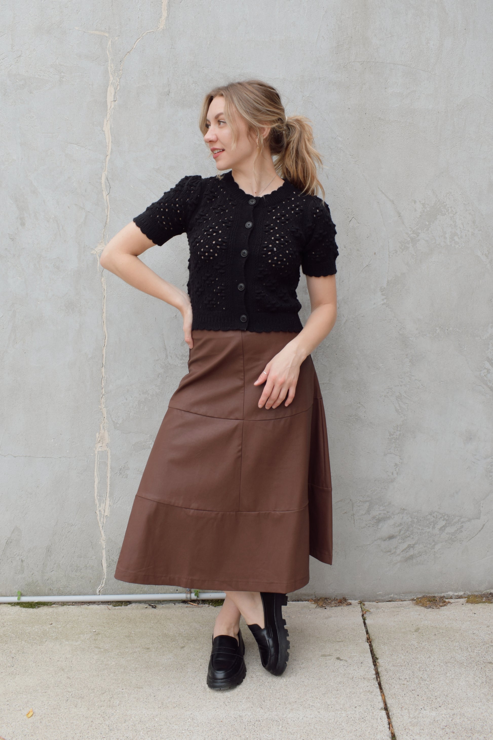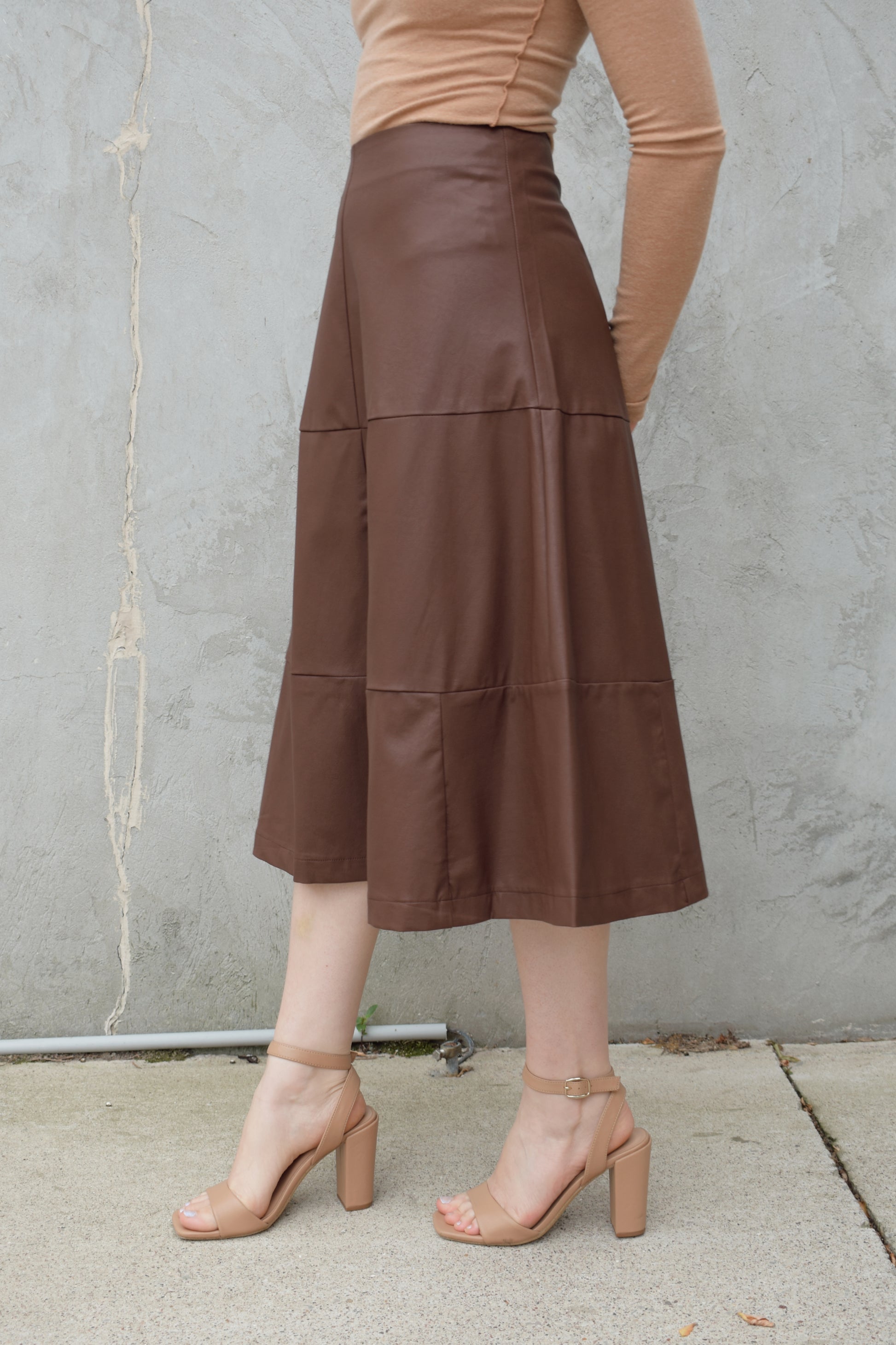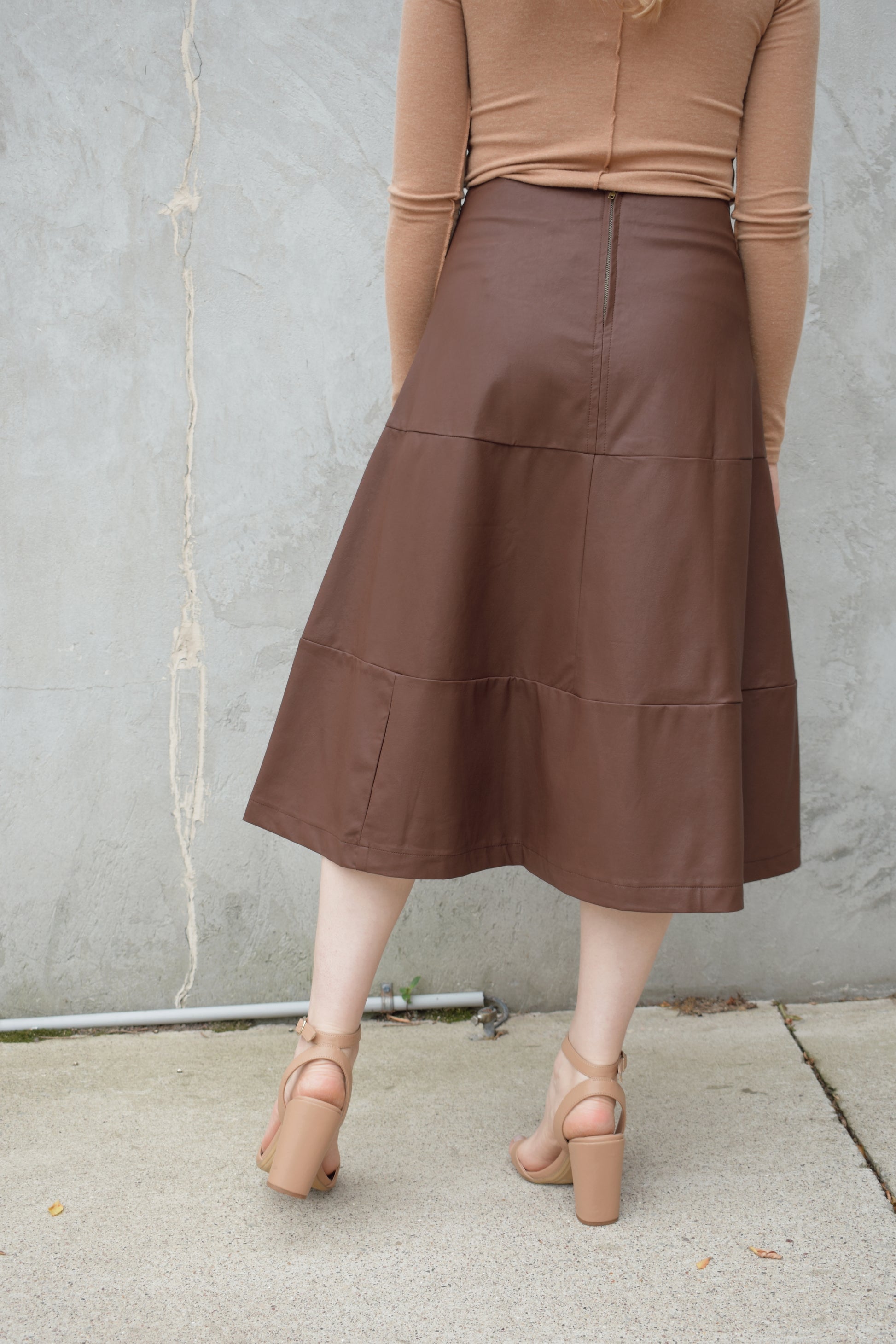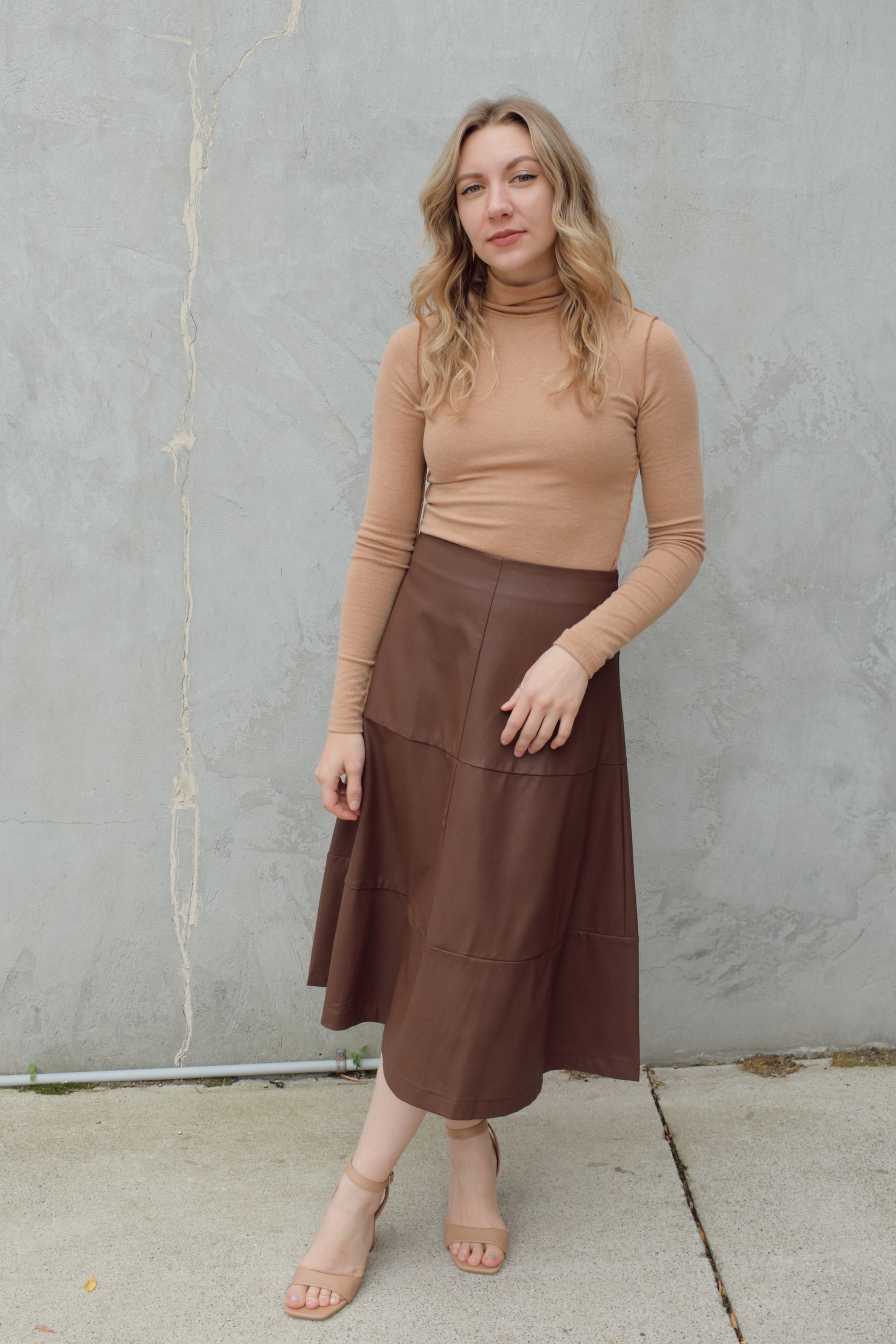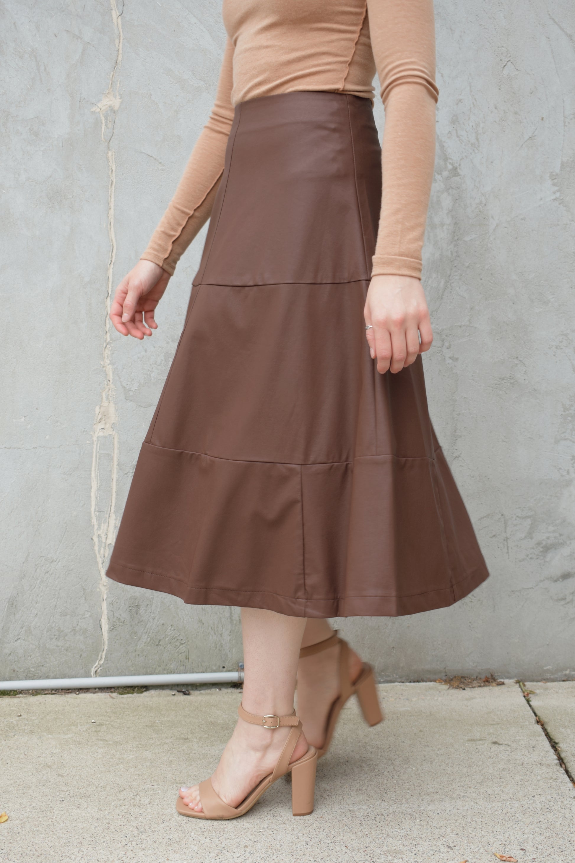 This midi-length faux leather A-line skirt showcases a striking square tiered design and a practical back zipper, offering a contemporary twist on a timeless shape. Style it casually with boots and a cozy sweater, pair it with a blouse and blazer for work, or elevate it for special events. It’s also perfect for capturing stunning photo shoot looks.