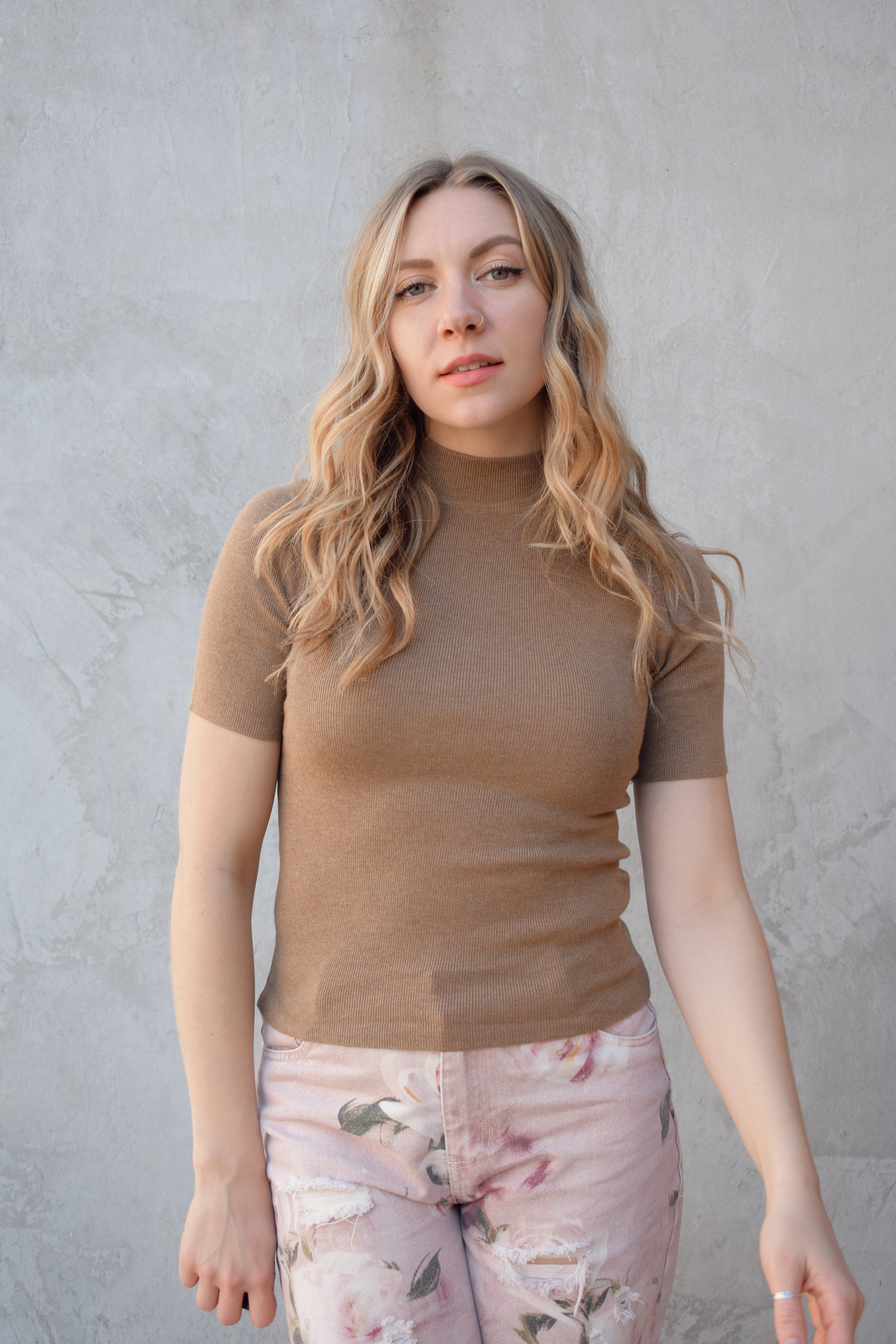 This ribbed knit top features short sleeves and a mock neckline, designed with stretch for a form-fitting silhouette. Perfect for fall and winter, it serves as a versatile layering essential that elevates your wardrobe basics.