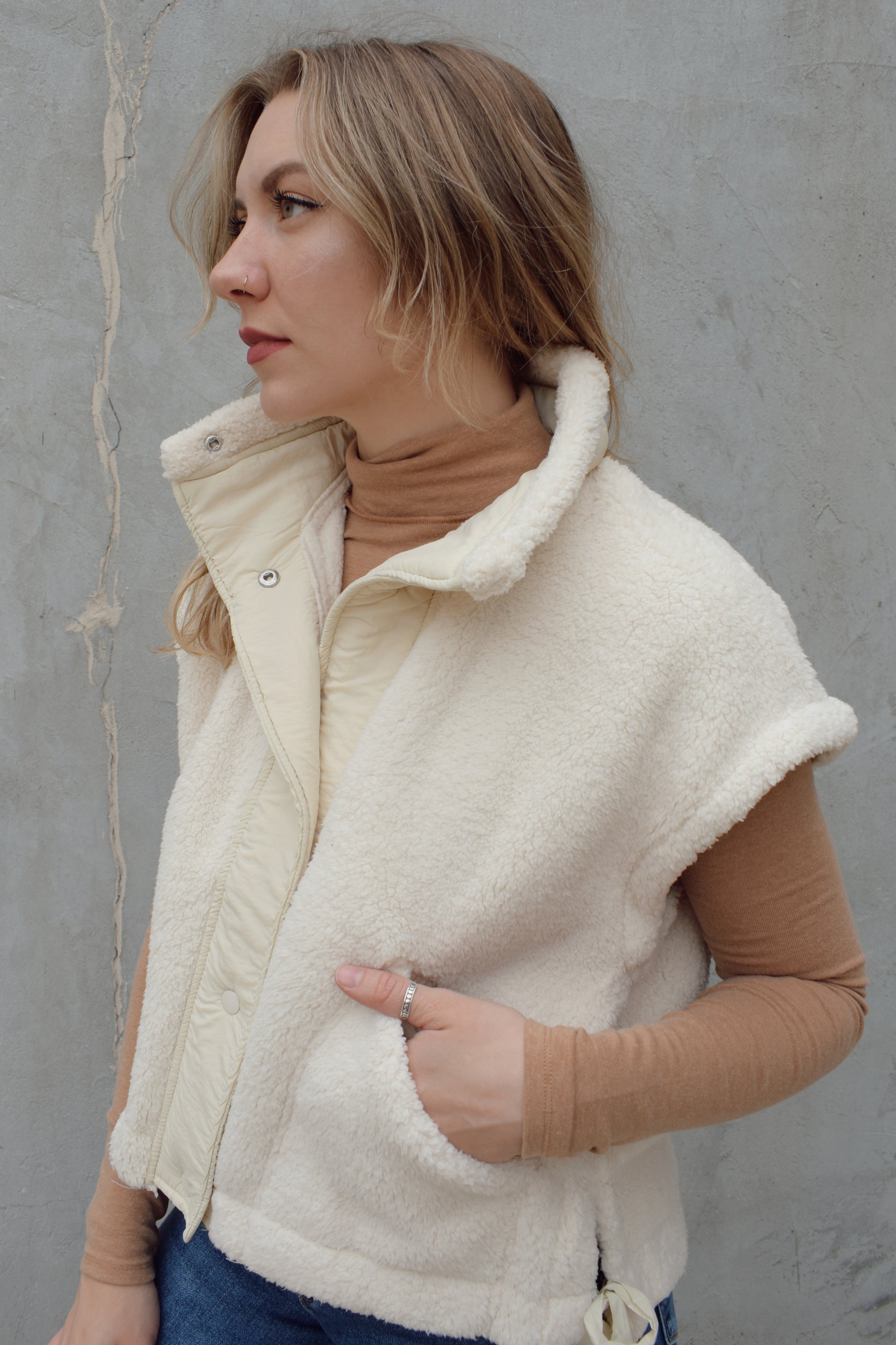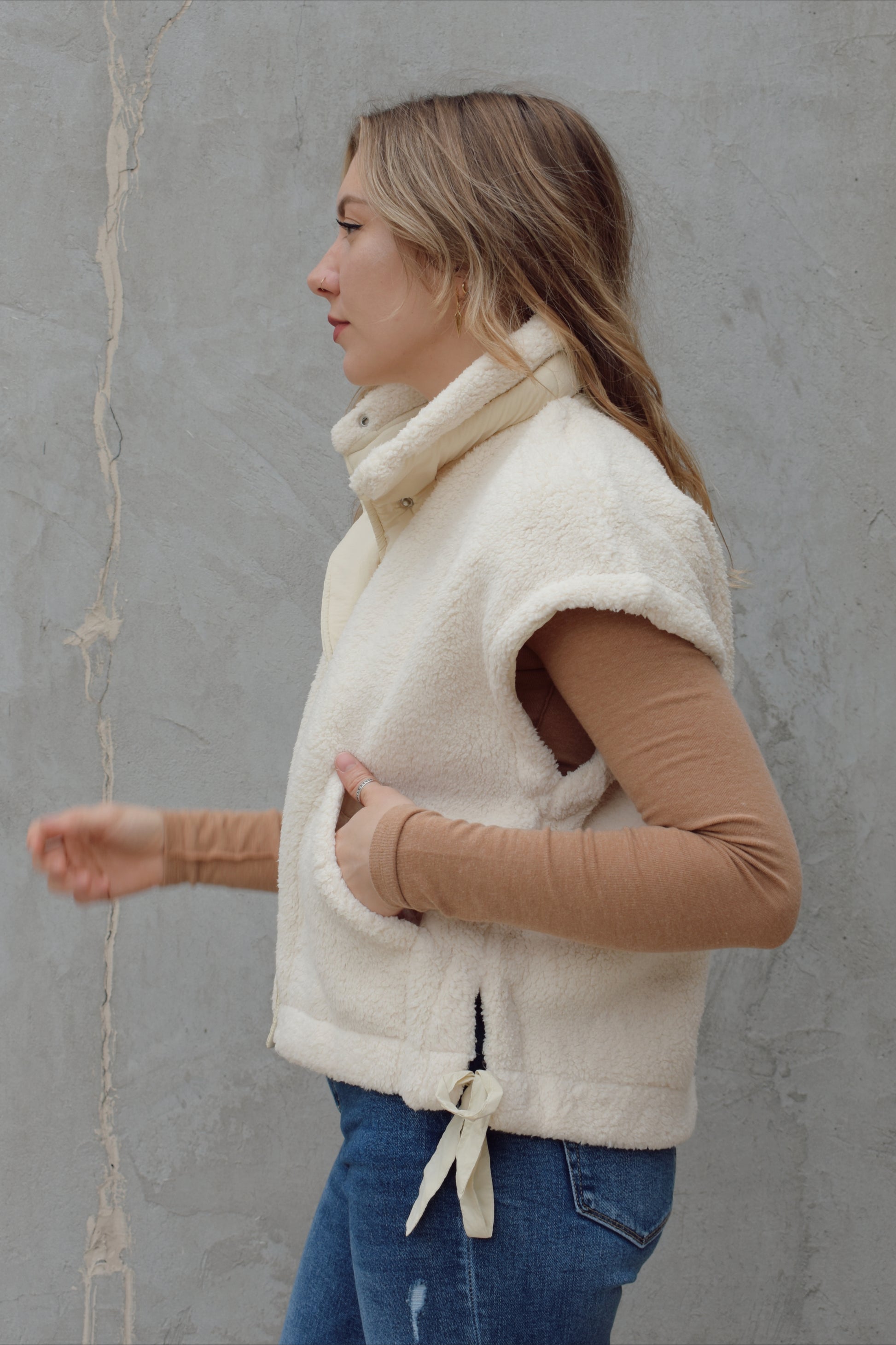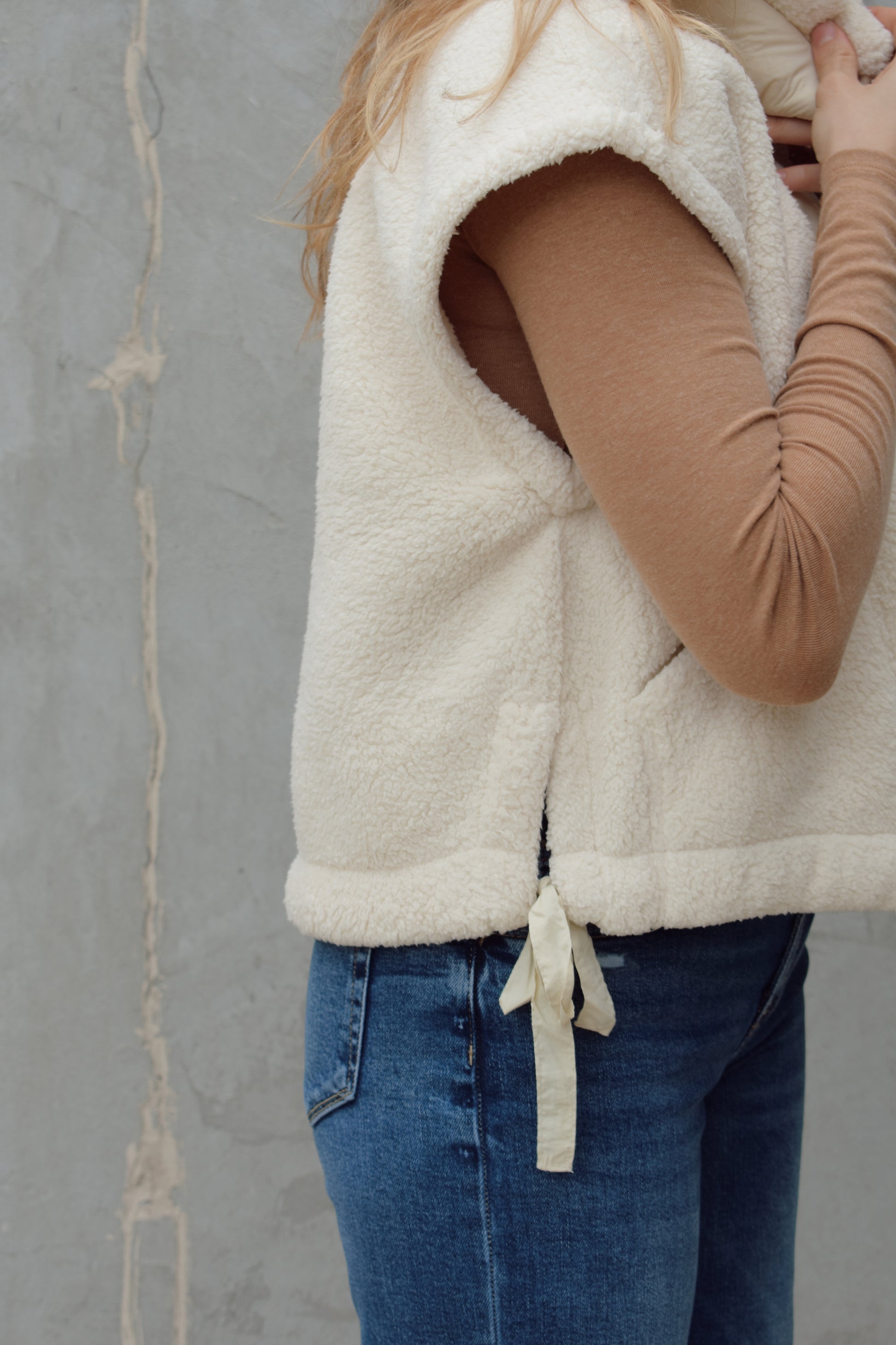 Embrace warmth and style with this plush sherpa vest, highlighted by a sleek quilted collar and adjustable side ties for a personalized fit. Its soft, textured exterior and generous cut make it ideal for layering over dresses or casual wear throughout cooler seasons. Equipped with roomy front pockets for added convenience.