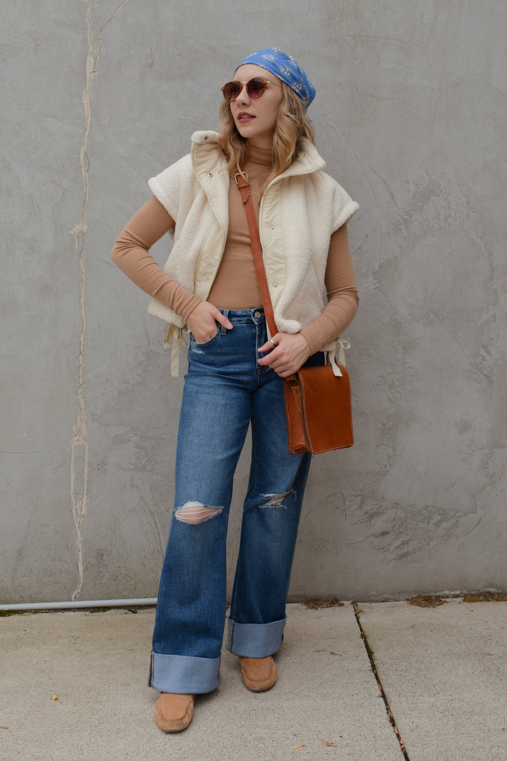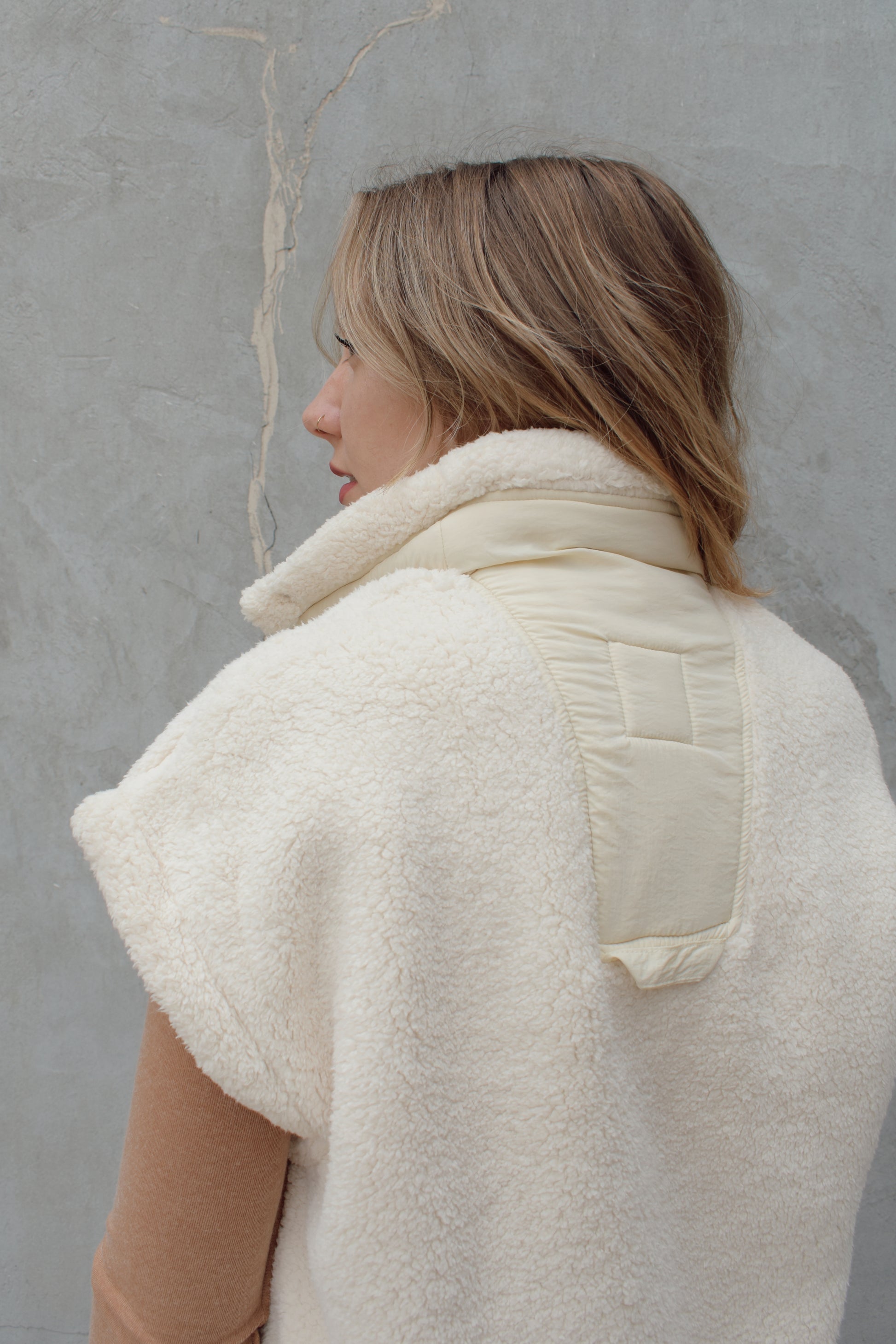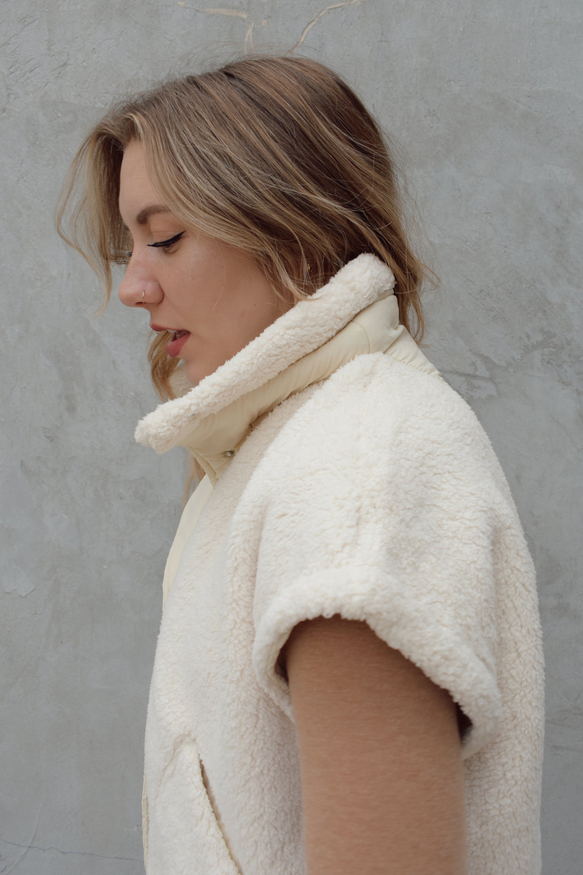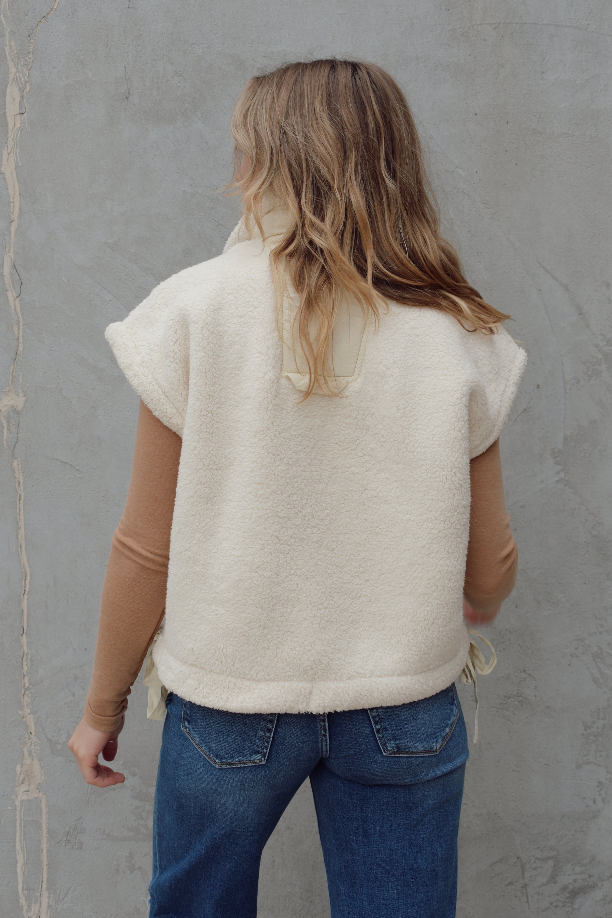Embrace warmth and style with this plush sherpa vest, highlighted by a sleek quilted collar and adjustable side ties for a personalized fit. Its soft, textured exterior and generous cut make it ideal for layering over dresses or casual wear throughout cooler seasons. Equipped with roomy front pockets for added convenience.