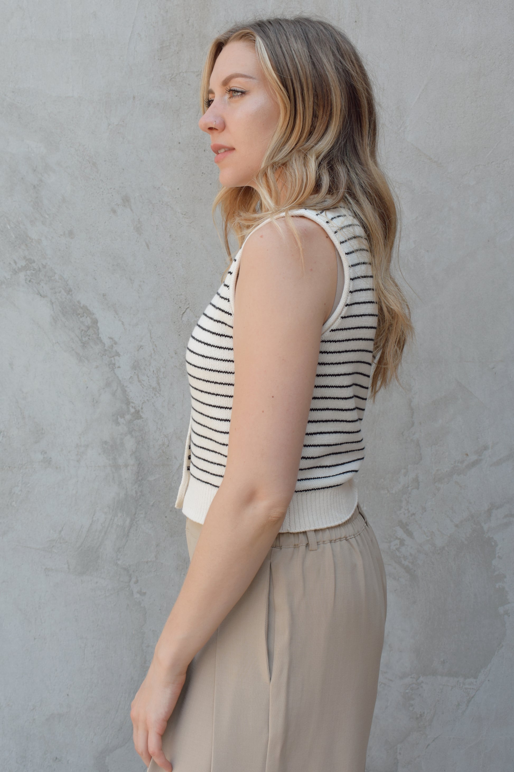 This striped knit vest is an essential layering piece for changing seasons. Crafted from a soft, breathable fabric, it offers comfort and style with a practical button-down front. Its lightweight, sleeveless design with ribbed edges pairs perfectly with tees, blouses, or can be worn alone for a sleek, simple look. The relaxed, slightly boxy fit ensures easy layering and effortless versatility.